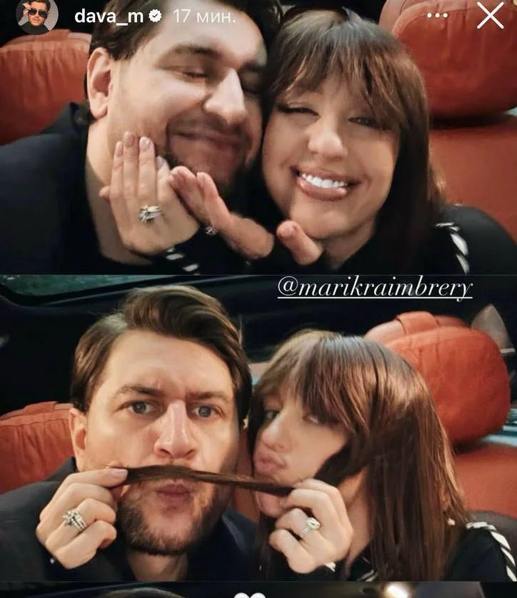 На фото — салон автомобиля, атмосфера послеконцертного счастья и двое влюблённых, которые не устают дурачиться вместе. Мари — в эффектном комбинезоне с анималистичным принтом (да-да, именно в нём она зажигала на Velvet Fest) строит гримасы и искренне смеётся. А Дава — рядом, и, кажется, совершенно очарован.