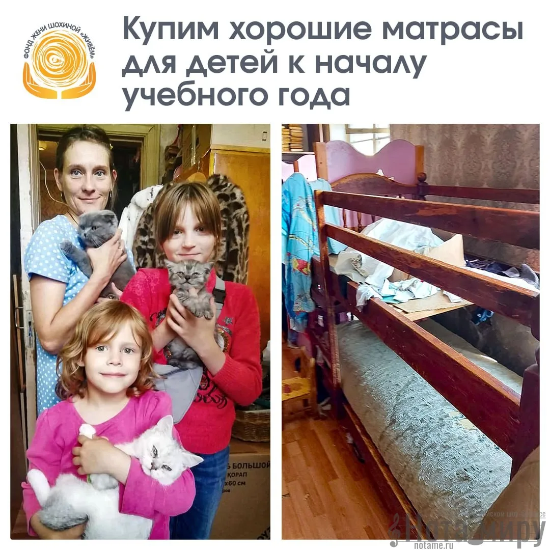 Друзья, наша компания старается проявлять социальную ответственность и помогать тем, кто нуждается в помощи.Совместно с благотворительным фондом Жени Шохиной «Живем» мы решили помочь многодетной семье из Москвы.Она состоит из мамы Анны, 6 детей, бабушки и прабабушки. У Анны непростая история – 6 детей, старший из которых с инвалидностью, и несколько лет назад умер муж, который заботился обо всей семье. Теперь заботы обо всех легли на саму хрупкую и красивую Анну. Не каждая женщина выдержит такое испытание, поэтому Анна не всегда справляется, ведь надо не только заработать денег, чтобы прокормить семью, но и приготовить, постирать, проследить, чтобы дети были ухожены.Поэтому порой часть дел по дому остается не сделанной, и в какой-то момент квартира оказалась захламлена настолько, что в ее разборе потребовалась помощь, тем более, что состоянием жилья заинтересовалась опека.Мы провели полный, насколько это возможно при таком количестве вещей, клининг в квартире. Покрасили и помыли окна и прочистили сантехнику, отремонтировали три шкафа. В ходе уборки пришлось выкинуть часть непригодной мебели и, в том числе, четыре матраса.Чтобы детям было на чем спать, нам нужна помощь в приобретении 4 матрасов для младших ребят и очень хочется успеть в самом начале учебного года.Необходимая сумма 32 000.