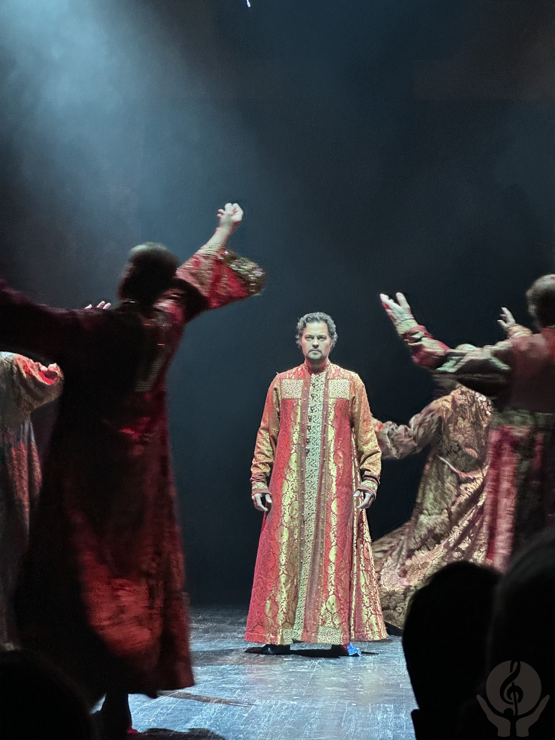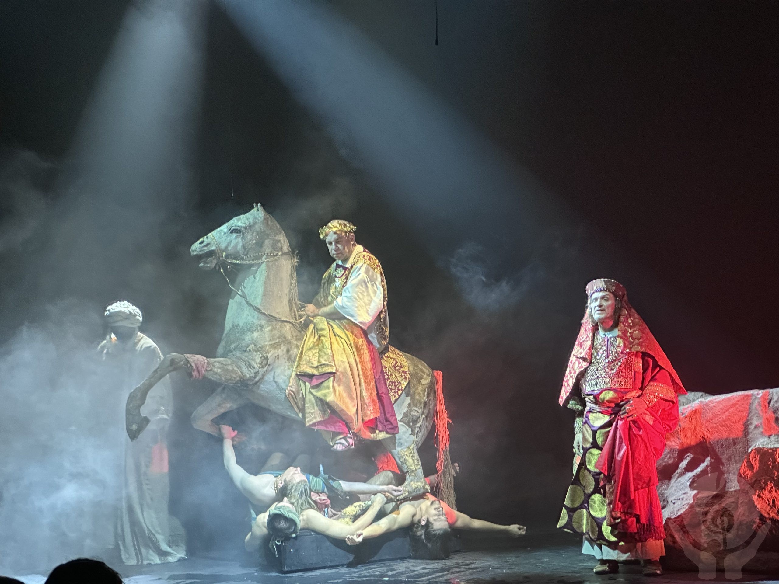 «Иуда?» не менее зрелищный спектакль, чем «Цезарь». Его премьера состоялась совсем недавно — в конце 2023 года, и он стал завершающей частью трилогии «Антихрист и Христос». Здесь драматург Александр Шишов выступает уже не в роли инсценировщика, а в качестве автора пьесы.
