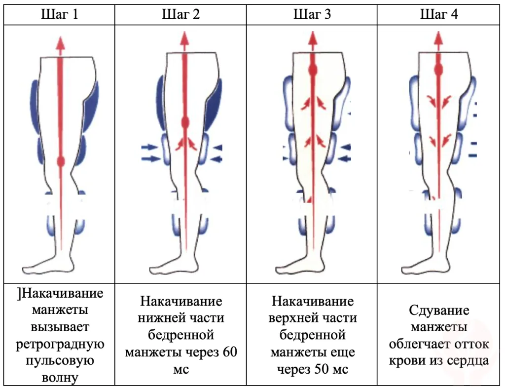 При расслаблении миокарда и наполнении кровью сердца и коронарных артерий, то есть, когда фиксируется диастола, происходит надувание манжет в направлении снизу-вверх. Такой принцип действия обусловливает характерную волну тока крови по направлению к сердцу. Благодаря этому кровоток в коронарных сосудах улучшается, что повышает качество трофики миокарда.