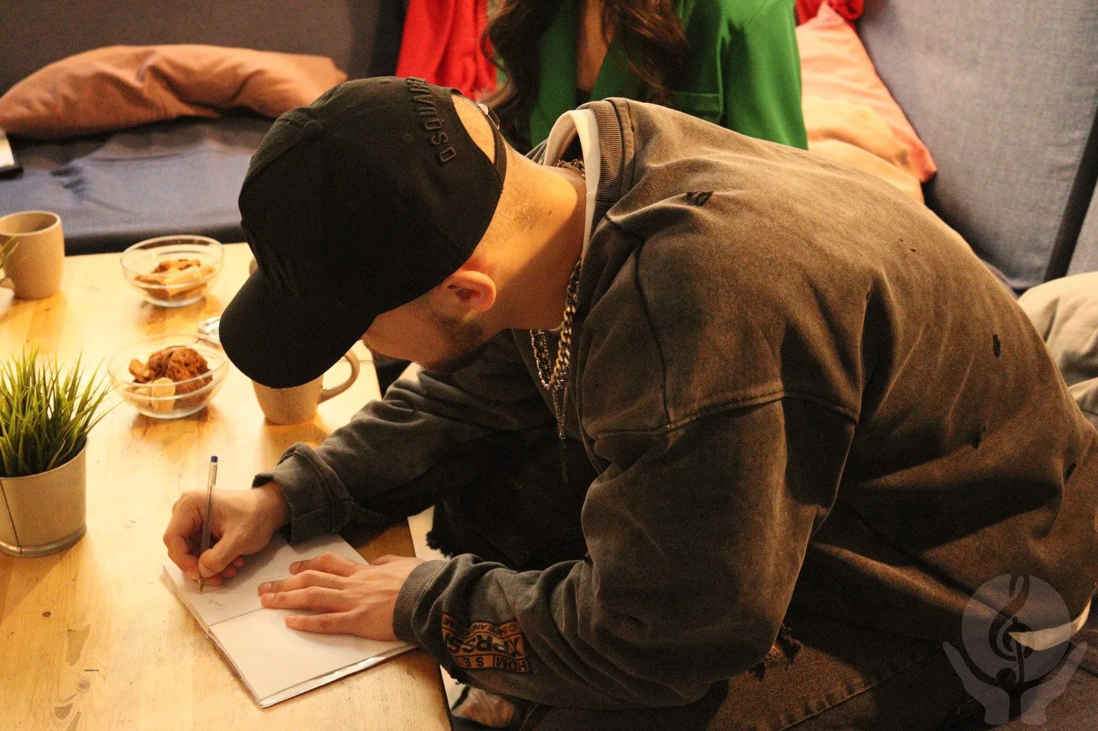 Диана: Он на самом деле очень сумасшедший в плане написания песен. Я вообще удивляюсь, как он пишет, потому что я сижу на студии, там просто какая-то каша. Мы его не трогаем, он сидит в телефоне и что-то записывает в заметках, а потом резко говорит нашему аранжировщику «так, всё, давай включай, сейчас будем петь».